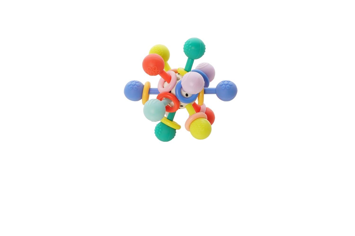 MULTISENSORY CLUTCHING BABY TOY: The Atom Rattle & Teether multi-sensory clutching rattle and teether encourages grasping and reaching which are important in gross motor skills development